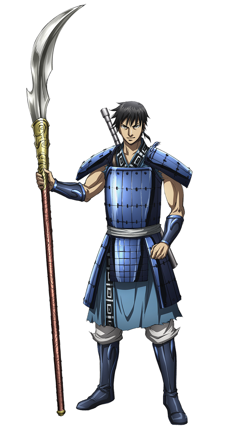 少年の頃に出会った秦王・嬴政しんおう・えいせいとは、かつて王都で起こったクーデターで共闘し、互いに信頼し合う仲となる。元・下僕の身ながら“天下の大将軍”になるという目標を胸に、高い戦闘力、不屈の精神力、直感的に戦いの流れや状況を見極め戦う“本能型の将ほんのうがたのしょう”としての才を武器に着実に実績を積んでいる。真っ直ぐで偽りがない人柄で部下からの信頼も厚い。破格の戦績を誇り、戦場では自らが中心に立ち隊を鼓舞する。